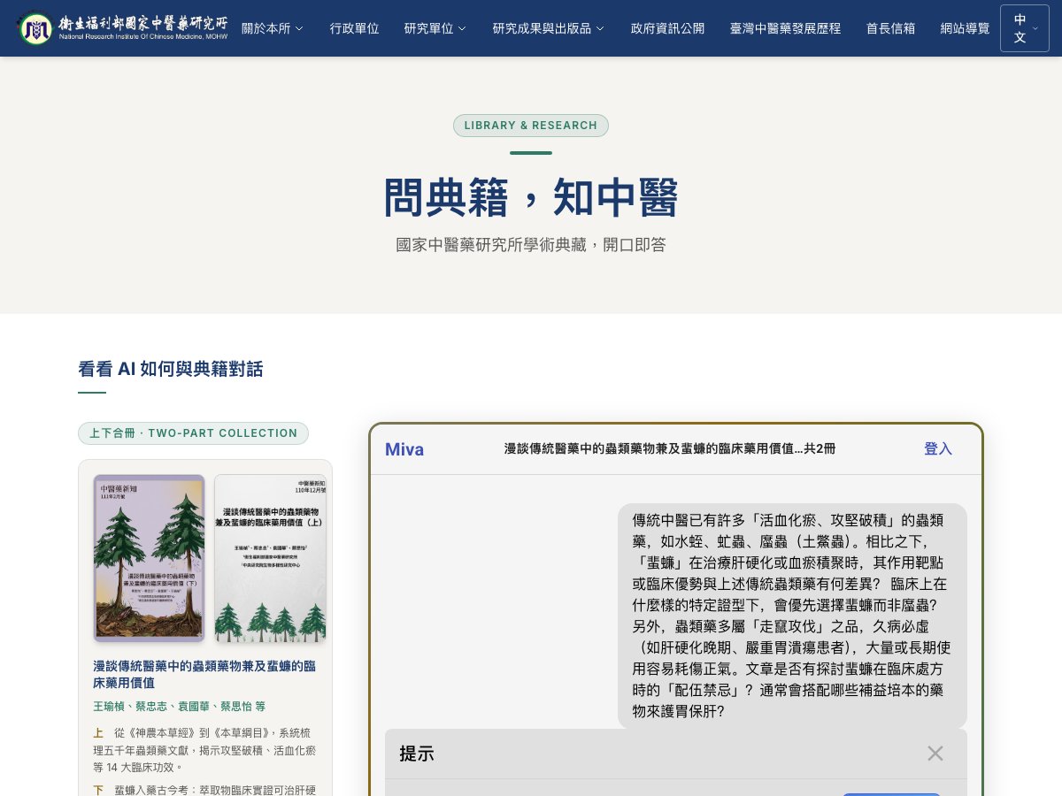 Decades of TCM academic publications from Taiwan's MOHW research institute, powered by BookAI BDN. Researchers, TCM physicians, and sinology scholars can query the classics directly in natural language — across languages, answered instantly.